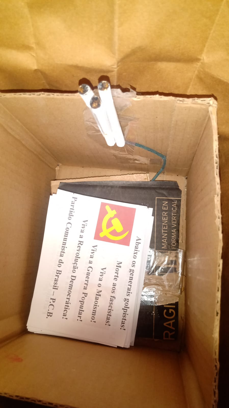 Nas sacolas, foram encontrados também papeis com bandeira alusiva ao Partido Comunista e mensagem em tom de ameaça: “morte aos facistas”, “abaixo os generais golpistas”, entre outros conteúdos.