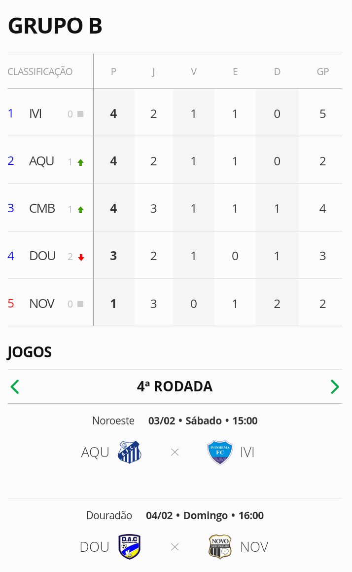 Dessa forma, os três primeiros colocados estão todos com quatro pontos: Ivinhema, Aquidauanense e Corumbaense. Em quarto lugar está o Dourados, com três pontos.