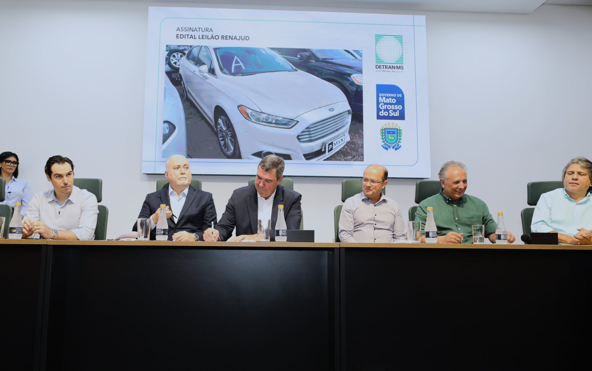 Na ocasião, o governador formalizou o termo de cooperação que autoriza a publicação do edital do primeiro leilão de veículos com restrição judicial (Renajud) do país, fruto de parceria com o TJMS (Tribunal de Justiça de Mato Grosso do Sul).