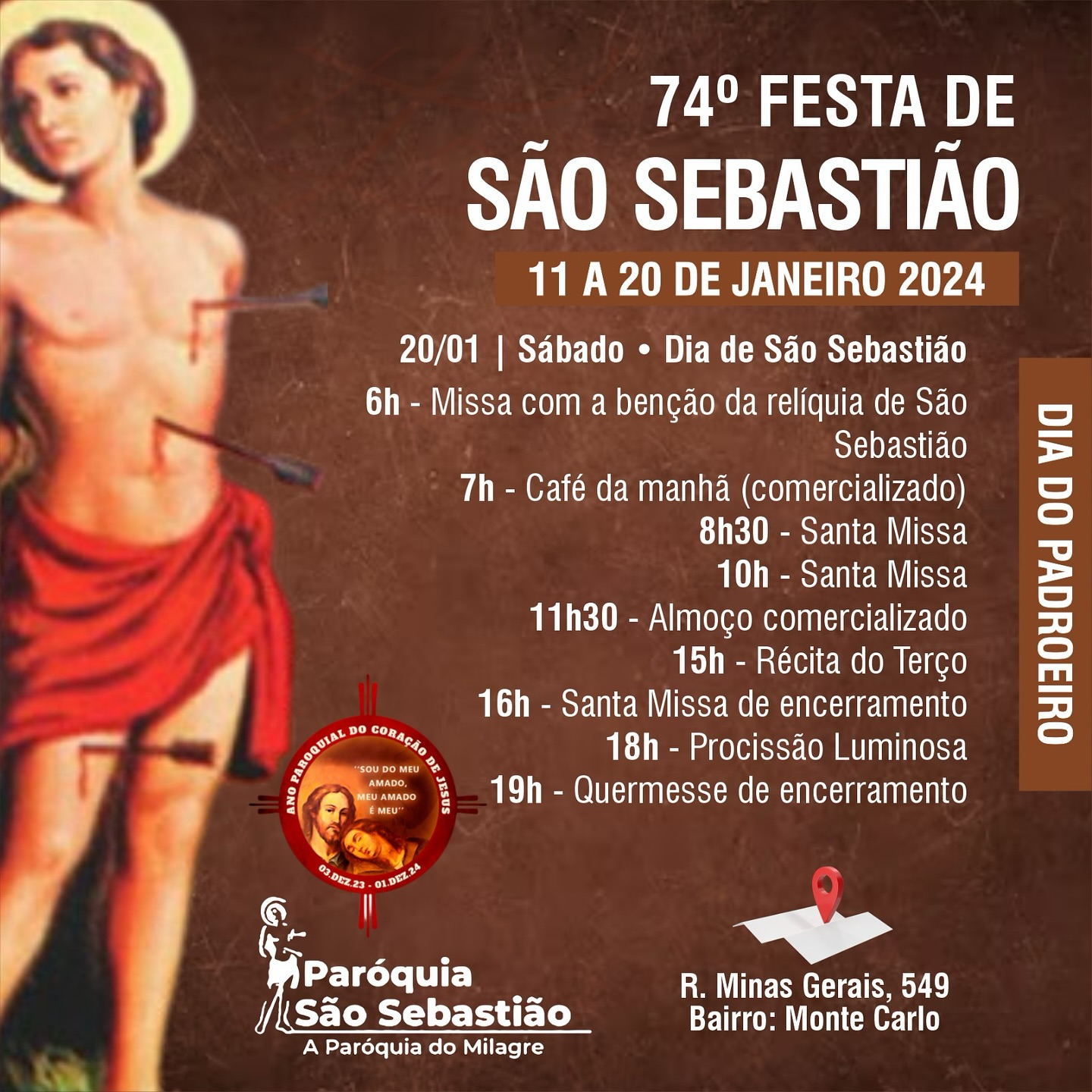 Nesse sábado (20), é celebrado pela Igreja Católica o Dia de São Sebastião, o protetor da humanidade contra a peste, a fome e a guerra. Em Campo Grande, desde o último dia 11 a paróquia do bairro Monte Carlo promove a tradicional festa que homenageia o santo padroeiro, proporcionando aos devotos momentos de oração, fé e confraternização.