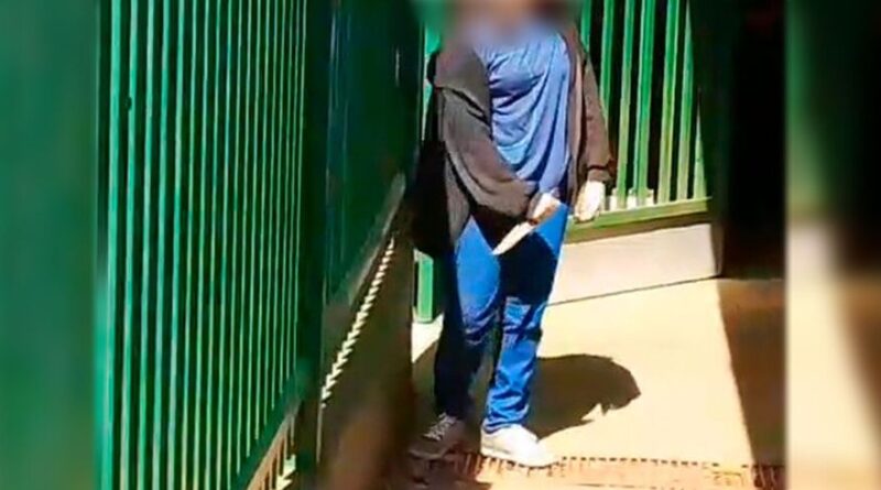 Entretanto, em um vídeo compartilhado nas redes sociais, é possível ver a estudante cercada por outros estudantes e servidores da escola, enquanto segura a faca.