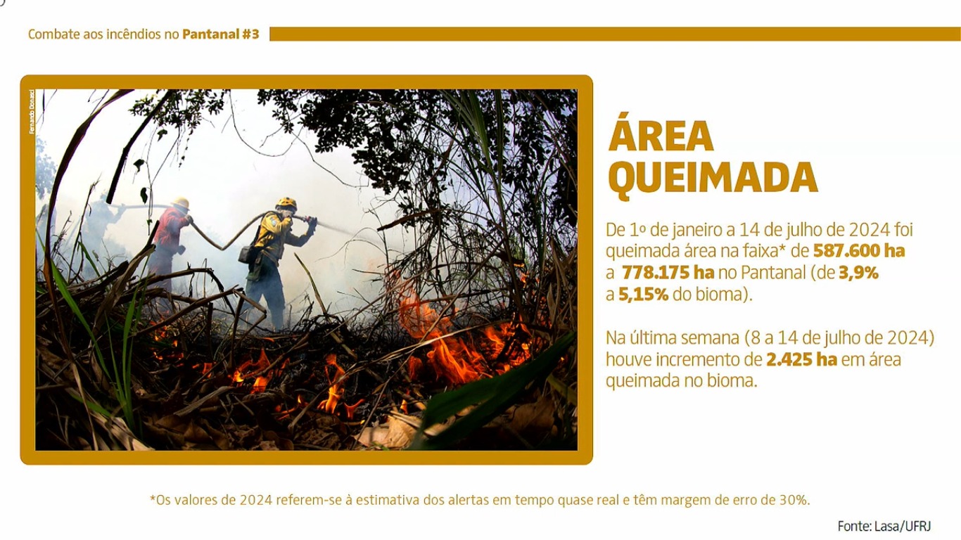 Conforme o balanço apresentado, dos 55 incêndios observados, 31 já foram extintos. Entre os 24 que continuam ativos, 22 estão controlados e apenas dois permanecem fora de controle. De 1º de janeiro a 14 de julho foi queimada uma área entre 587.600 hectares e 778.175 hectares no Pantanal, de 3,9% a 5,15% do bioma. Na última semana (8 a 14 de julho), houve um incremento de 2.425 ha em área queimada.