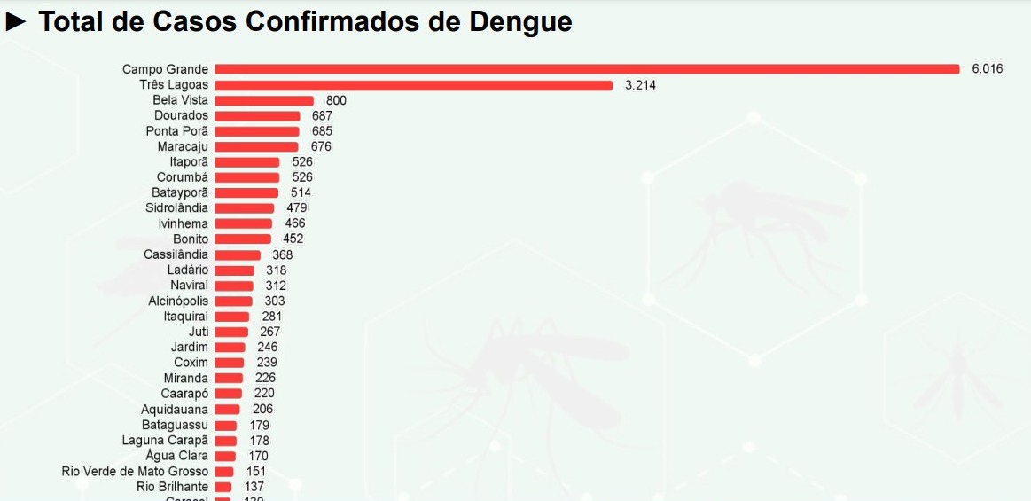 Na lista de cidades com mais casos já confirmados de dengue, Campo Grande alcançou a marca de 6.016, sendo 171 casos novos em sete dias. Três Lagoas é a segunda cidade de MS com mais pessoas que já contraíram a doença ao menos uma vez neste ano, sendo 3.214, aumento de 263 casos no período. Em terceiro lugar está Bela Vista, com 800 casos, cinco a mais do que há uma semana.