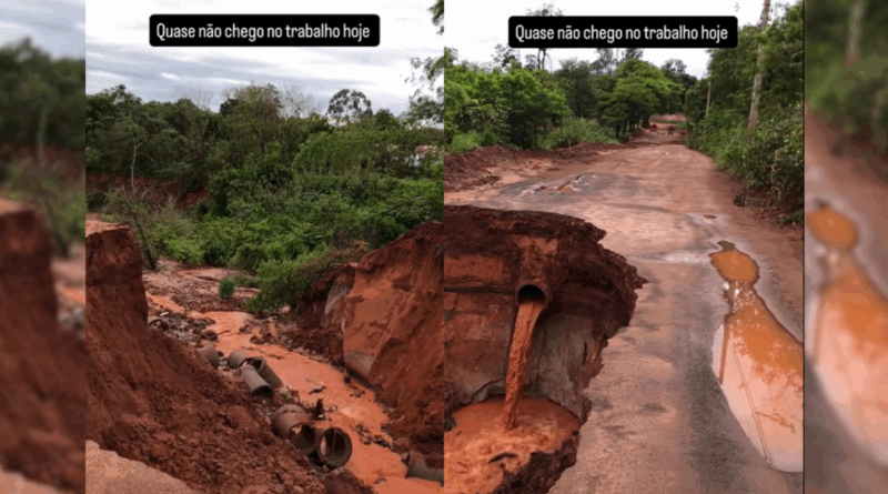 Até parece uma imagem antiga, mas não é. Acredite, a Estrada SE 1, no bairro Chácara dos Poderes, em Campo Grande, foi engolida por uma cratera novamente. O desmoronamento ocorreu na quinta-feira (13), após um novo temporal que deixou diversos barros alagados.