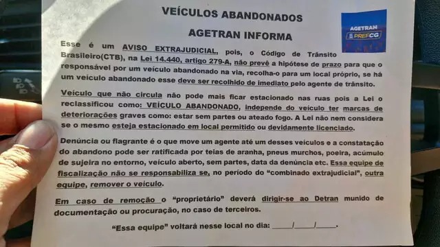 Procurada pela reportagem, a Agetran confirmou o envio do aviso extrajudicial alegando que houve denúncias de veículos abandonados na região. Com isso, os proprietários deverão informar a situação de seus veículos como forma de identificá-los.
