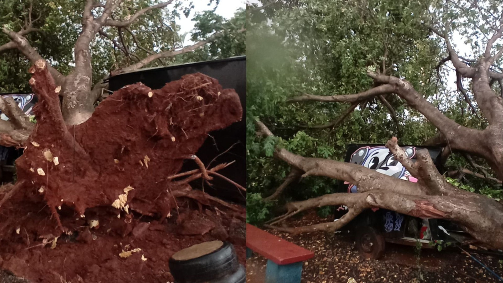 Houve registro de queda de árvore na Rua Madame Butterfly, no Bairro Estrela do Sul, danificando o alambrado de um campo de futebol, na praça.