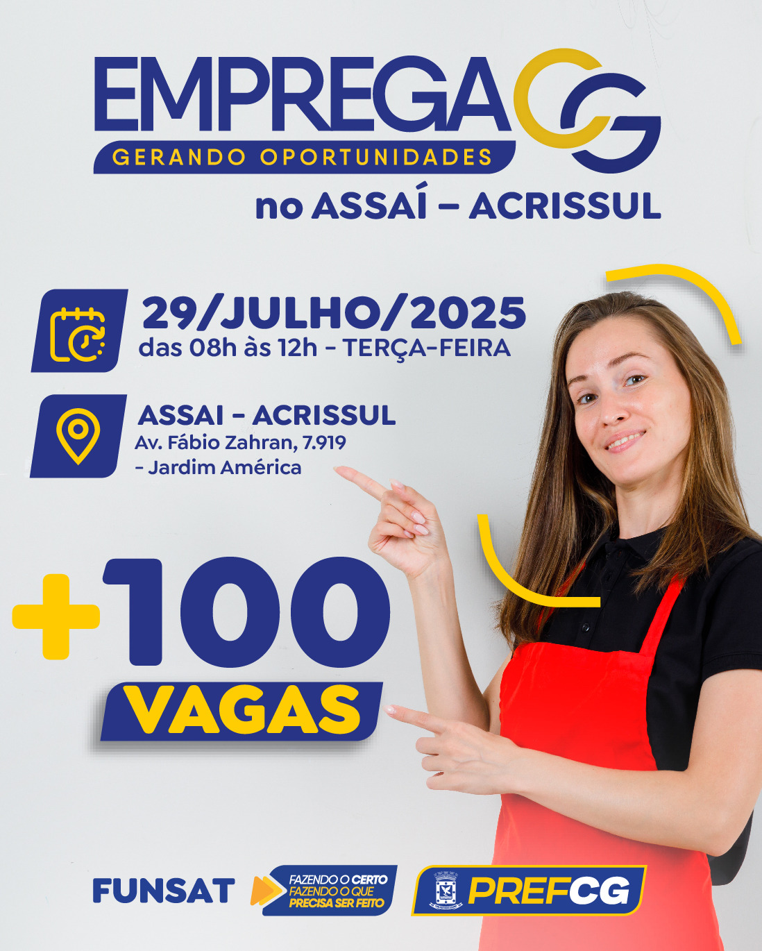 A Funsat (Fundação Social do Trabalho) realiza, nesta terça-feira (28), a 25ª edição do Emprega CG Itinerante de 2025, desta vez no bairro Jardim América. A ação contará com 100 vagas para encaminhamento imediato a entrevistas de emprego, com foco no recrutamento de profissionais para a rede Assaí Atacadista, especialmente para a unidade localizada na Avenida Fábio Zahran.