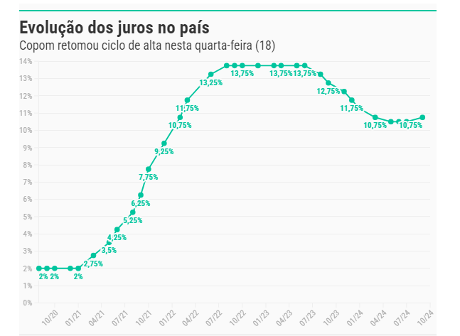 O Comitê de Política Monetária (Copom) do Banco Central anunciou nesta quarta-feira (18) o aumento da taxa Selic para 10,75% ao ano, uma elevação de 0,25 ponto percentual. Esta é a primeira vez que a autoridade monetária aumenta a taxa básica de juros desde agosto de 2022, há dois anos e um mês. A decisão foi unânime entre os diretores do órgão.