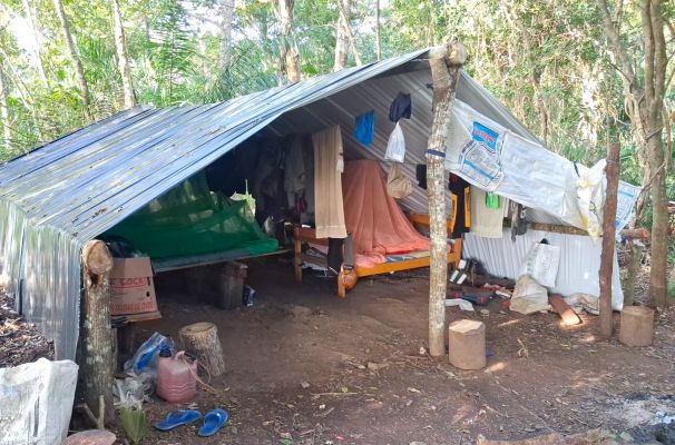 No local, os trabalhadores montaram barracos improvisados com troncos de árvores e lonas plásticas. Eles dormiam em “tarimbas” – camas feitas com galhos – e utilizavam colchões velhos trazidos do Paraguai. Sem acesso a banheiro, faziam as necessidades fisiológicas no mato, bebiam água de um córrego – armazenada em galões de óleo reutilizados – e tomavam banho ao ar livre. Não havia energia elétrica nem qualquer infraestrutura básica.
