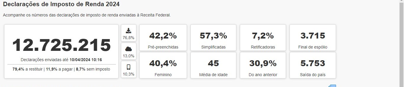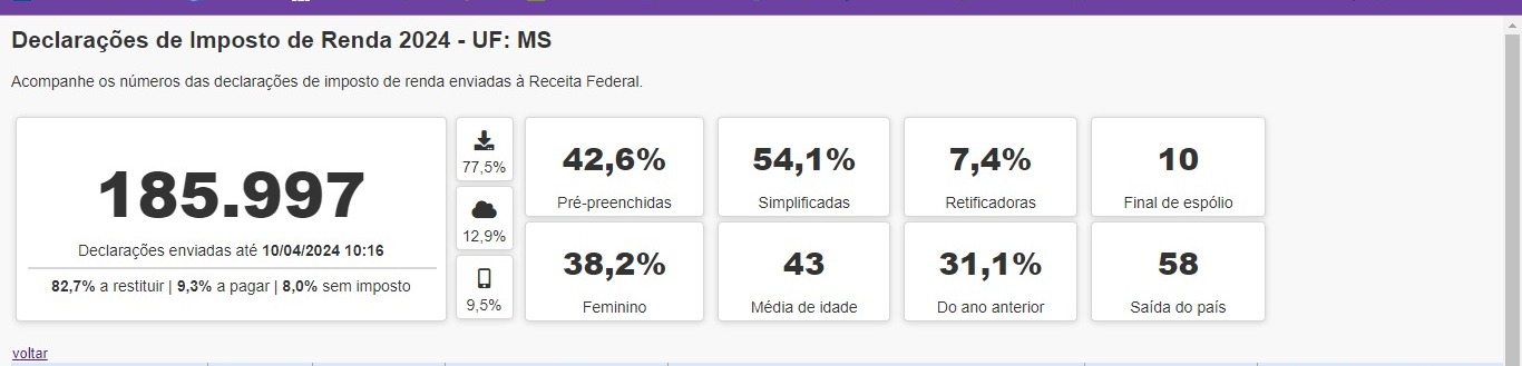Mais de 185 mil declarações do Imposto de Renda da Pessoa Física (IRPF) já foram entregues à Receita Federal pelos contribuintes residentes em Mato Grosso do Sul. Os dados constam no sistema de monitoramento online do órgão, com os documentos enviados até às 10h16 (DF) dessa quarta-feira (10).