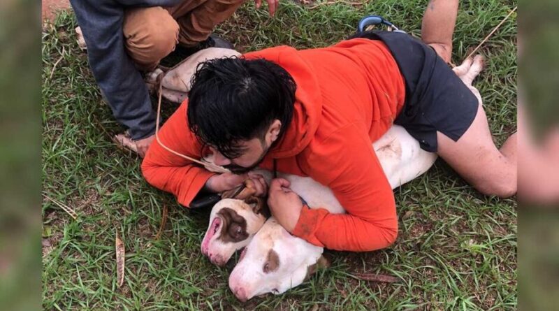 No vídeo, é possível ver outras pessoas amarrando as patas dos cães enquanto o lutador segue os pressionando contra o chão para não escaparem.