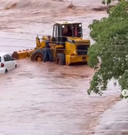 Na rotatória do bairro São Francisco, o Córrego Segredo transbordou pela segunda vez em menos de 24 horas. Vídeo compartilhado nas redes sociais mostra o momento em que as águas invadem o asfalto. Uma pá-carregadeira da Prefeitura Municipal foi usada para retirar um veículo que acabou preso no meio da enxurrada.