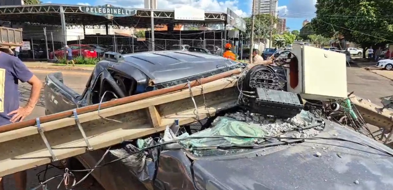A queda de quatro postes de energia elétrica e iluminação por conta uma caçamba levantada de um caminhão deixou dois veículos danificados e um motorista, de 65 anos, preso nos destroços em Campo Grande.