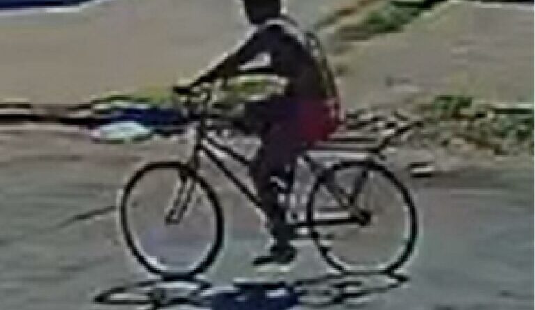 Imagens de câmeras de videomonitoramento registraram o momento em que a mulher chega ao imóvel de bicicleta e invade a casa, abrindo o portão.
